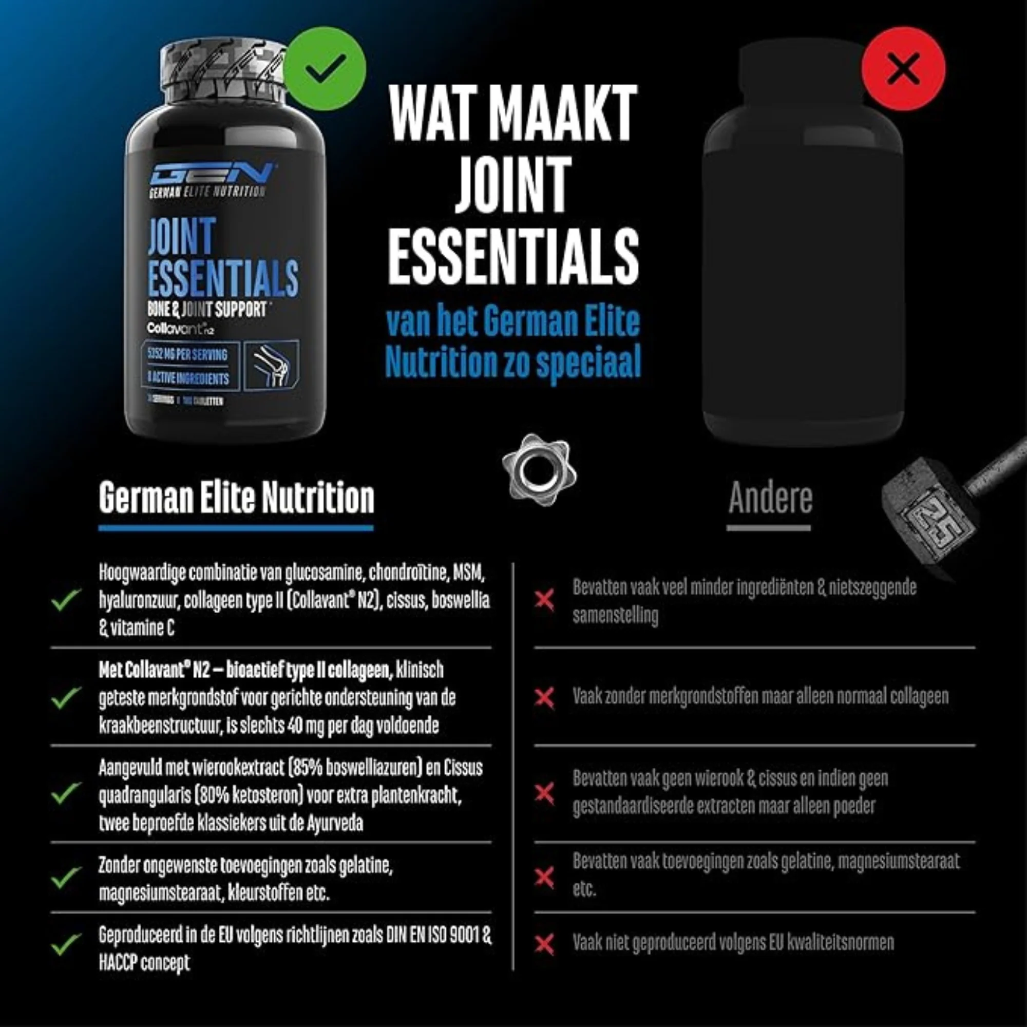 GEN Joint Essentials bevat een krachtige basis van glucosamine HCL, chondroïtinesulfaat en MSM. Deze drie stoffen zijn belangrijke bouwstenen van kraakbeen en bindweefsel en worden vaak samen toegepast. Met 1200mg van elk per dagelijkse dosering krijg je een solide ondersteuning voor iedereen die zijn gewrichten extra wil verzorgen.