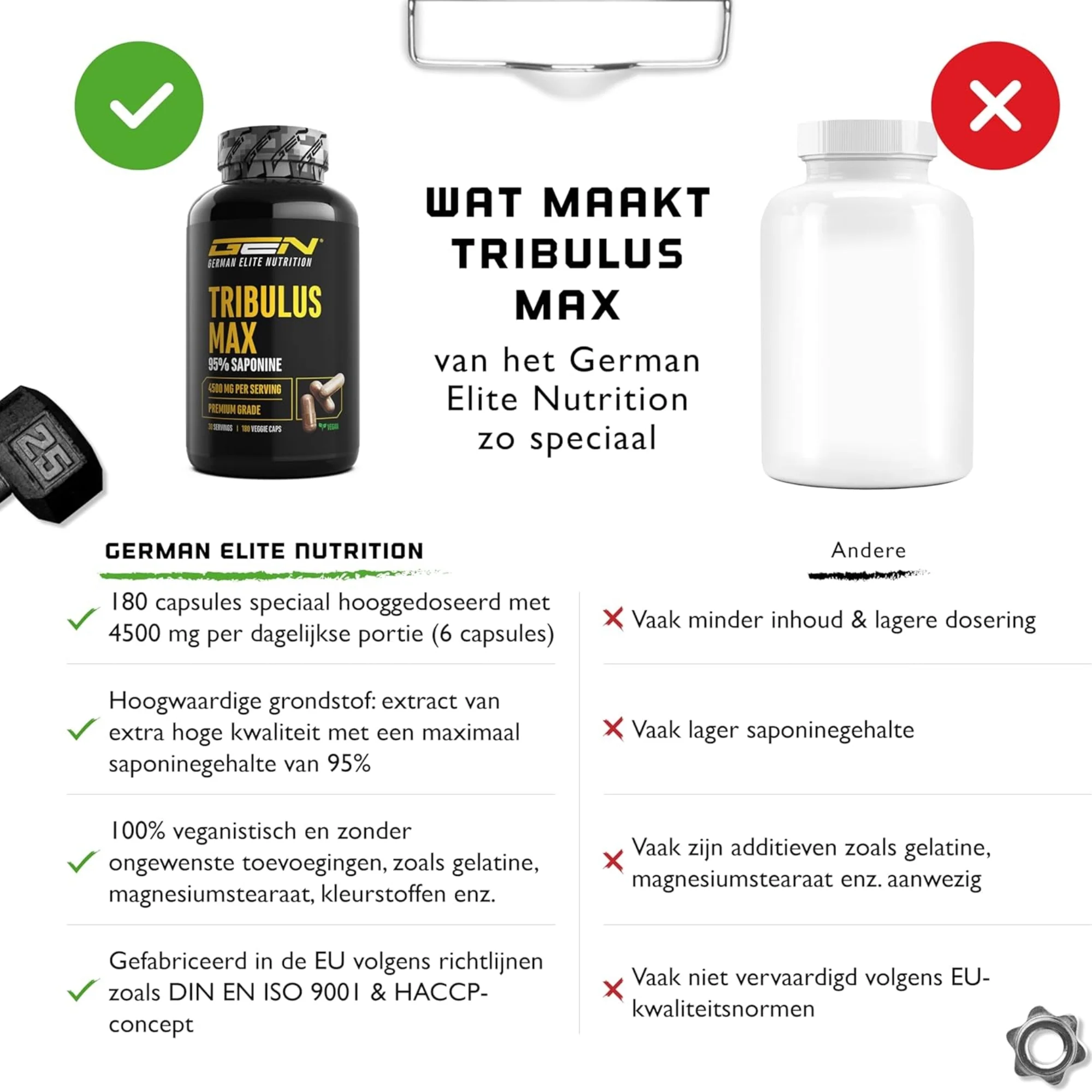 German Elite Nutrition gebruikt een 10:1-extract van premium Tribulus-planten, zorgvuldig geselecteerd op hun saponineconcentratie. Hierdoor bevat elke dagdosering van 6 capsules maar liefst 4500mg Tribulus-extract, waarvan 4275mg saponinen.