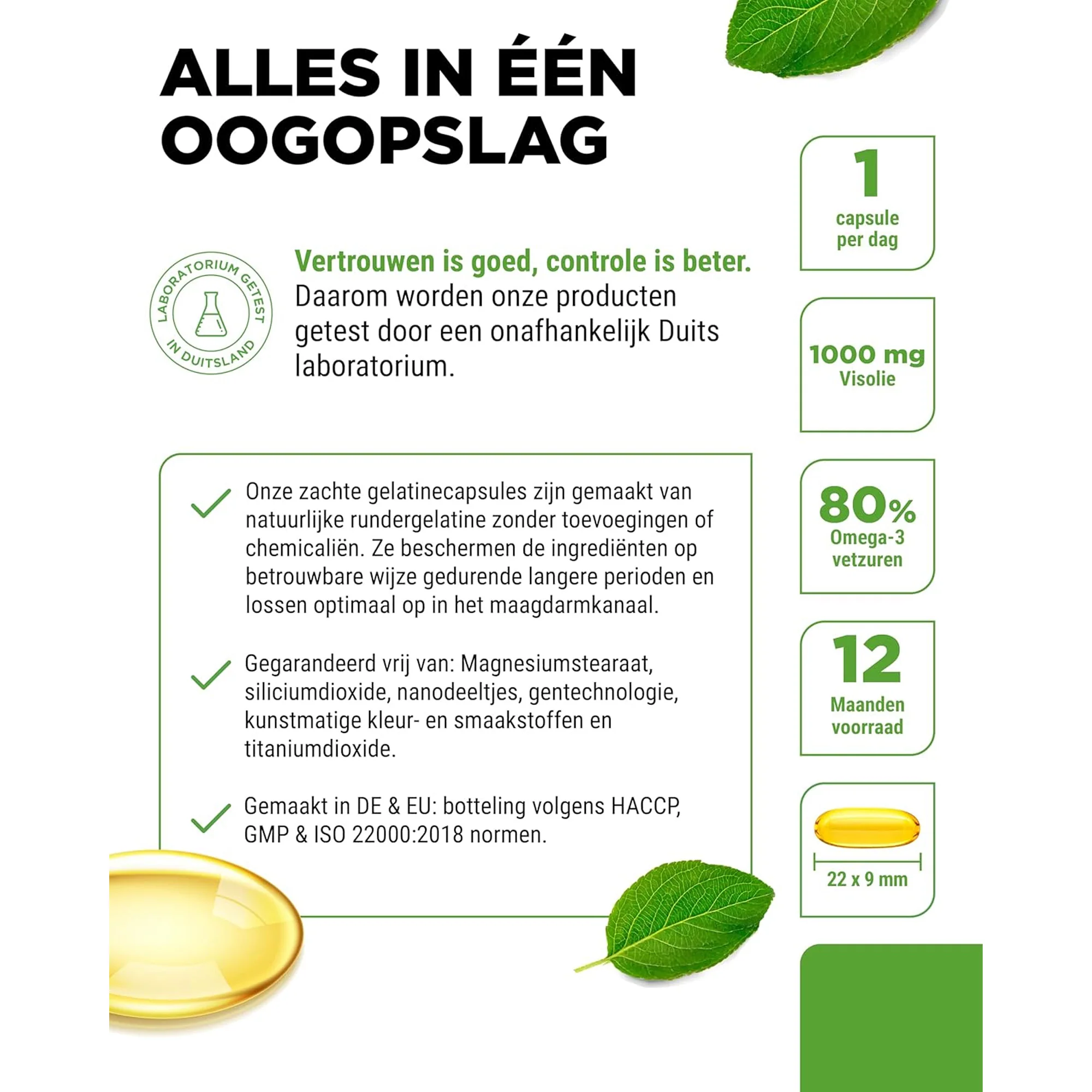 Elke softgel levert 1000 mg zuivere visolie met minimaal 800 mg totale omega-3 vetzuren. Daarvan is 400 mg eicosapentaeenzuur (EPA) en 300 mg docosahexaeenzuur (DHA) – precies de ratio die in onderzoek het meest effectief is voor hart, hersenen en gezichtsvermogen.